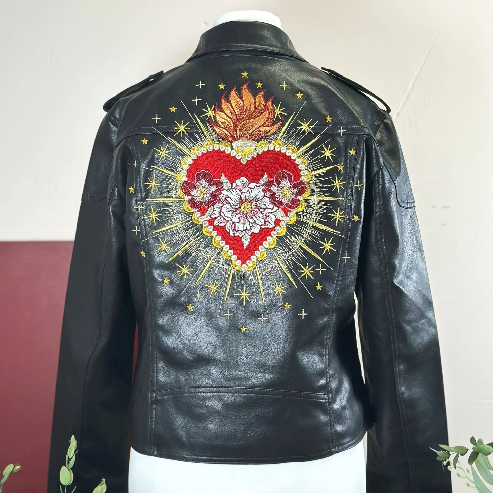 Featuring intricate details and rich textures, this sacred heart design combines elegance with edge, creating a stand out piece for any wardrobe.